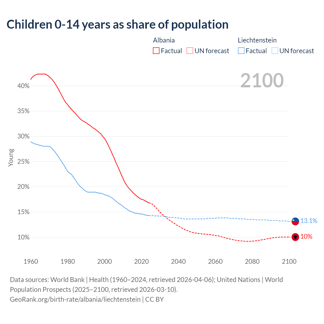 Data sources: World Bank | Health (1960–2024, retrieved 2026-04-06); United Nations | World Population Prospects (2025–2100, retrieved 2026-03-10).