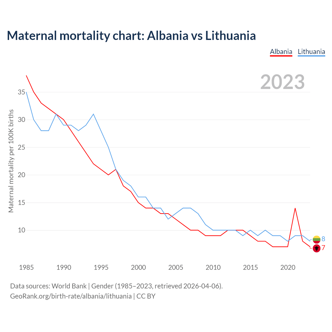 The maternal mortality rate, which is the probability of dying during childbirth or within 42 days of pregnancy termination, is 7 deaths per 100,000 live births in Albania, compared to 8 deaths in Lithuania.