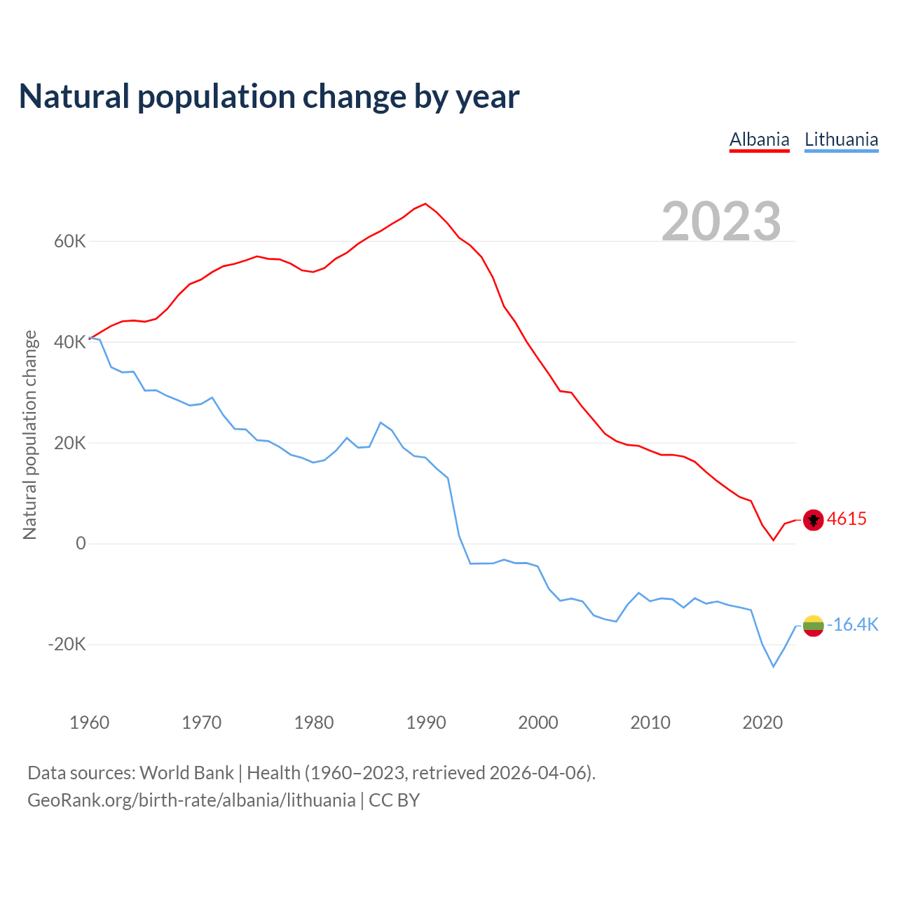 - Albania is ranked 143/196 by birth rate compared to 185/196 for Lithuania.