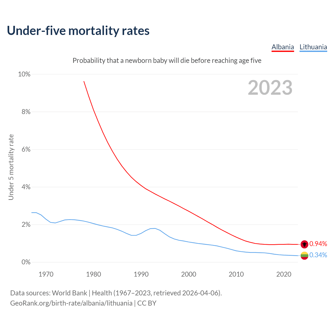 The chance that a newborn baby will die before reaching age five is 0.94% in Albania and 0.34% in Lithuania. Above is a chart with historical data on under-five mortality rates.