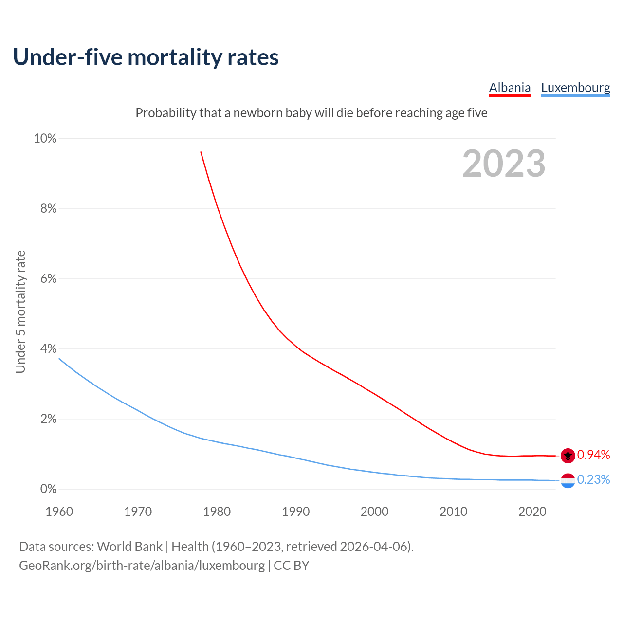 The chance that a newborn baby will die before reaching age five is 0.94% in Albania and 0.23% in Luxembourg. Above is a chart with historical data on under-five mortality rates.