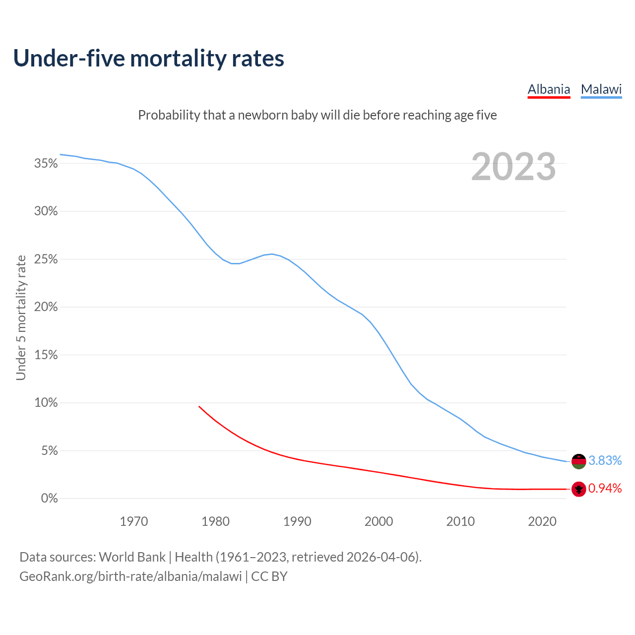 The chance that a newborn baby will die before reaching age five is 0.94% in Albania and 3.83% in Malawi. Above is a chart with historical data on under-five mortality rates.