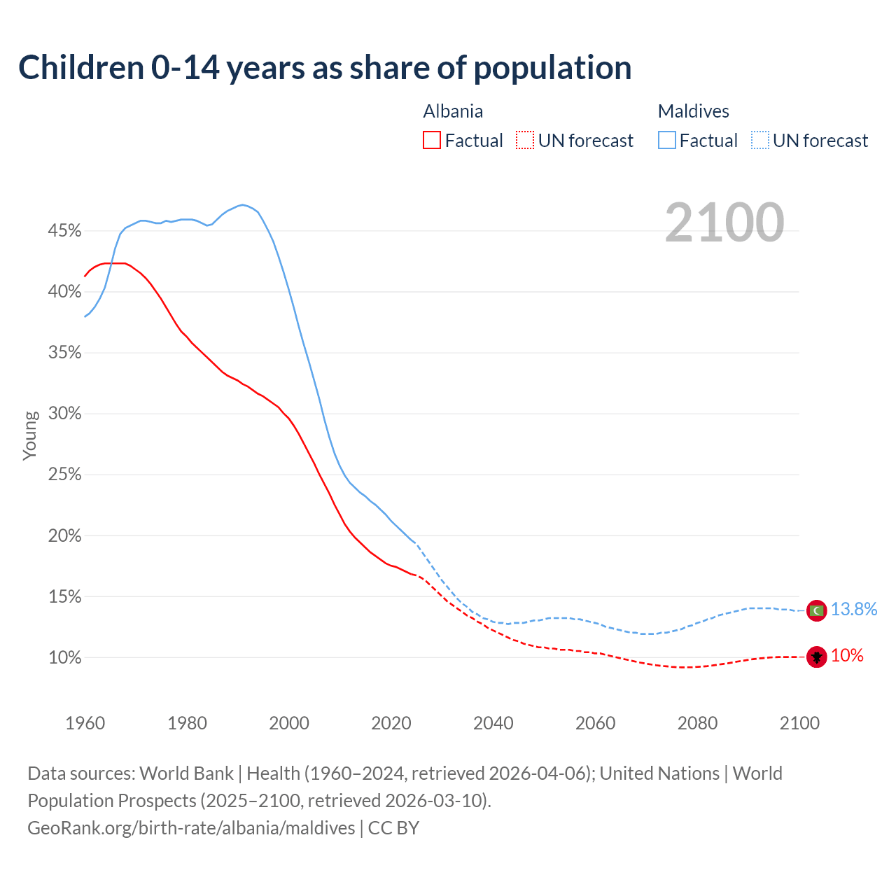 According to the latest available data on birth rates, the fertility rate in Albania was 1.35 children per woman in 2023, compared to 1.58 in Maldives in 2023. The replacement level is considered to be 2.1 children per woman.