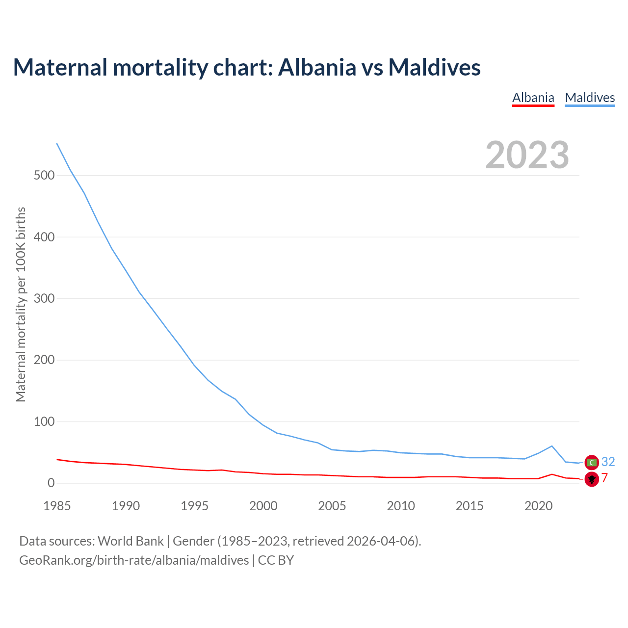 The maternal mortality rate, which is the probability of dying during childbirth or within 42 days of pregnancy termination, is 7 deaths per 100,000 live births in Albania, compared to 32 deaths in Maldives.