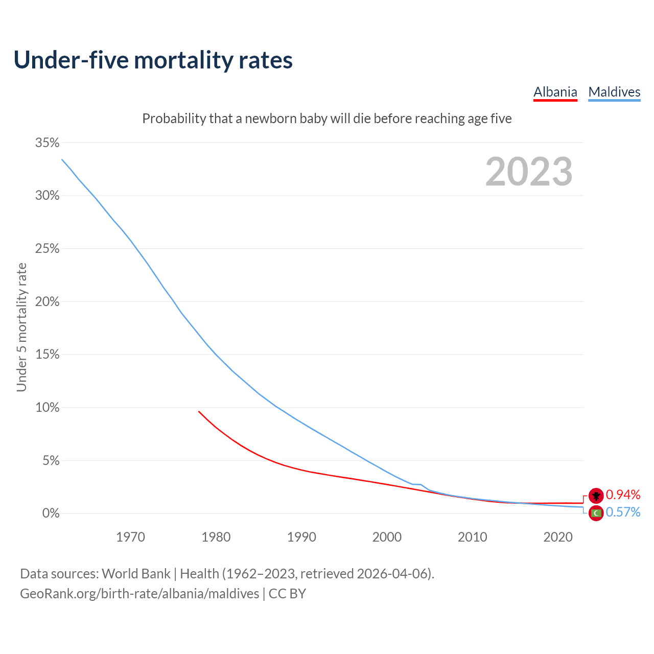 The chance that a newborn baby will die before reaching age five is 0.94% in Albania and 0.57% in Maldives. Above is a chart with historical data on under-five mortality rates.