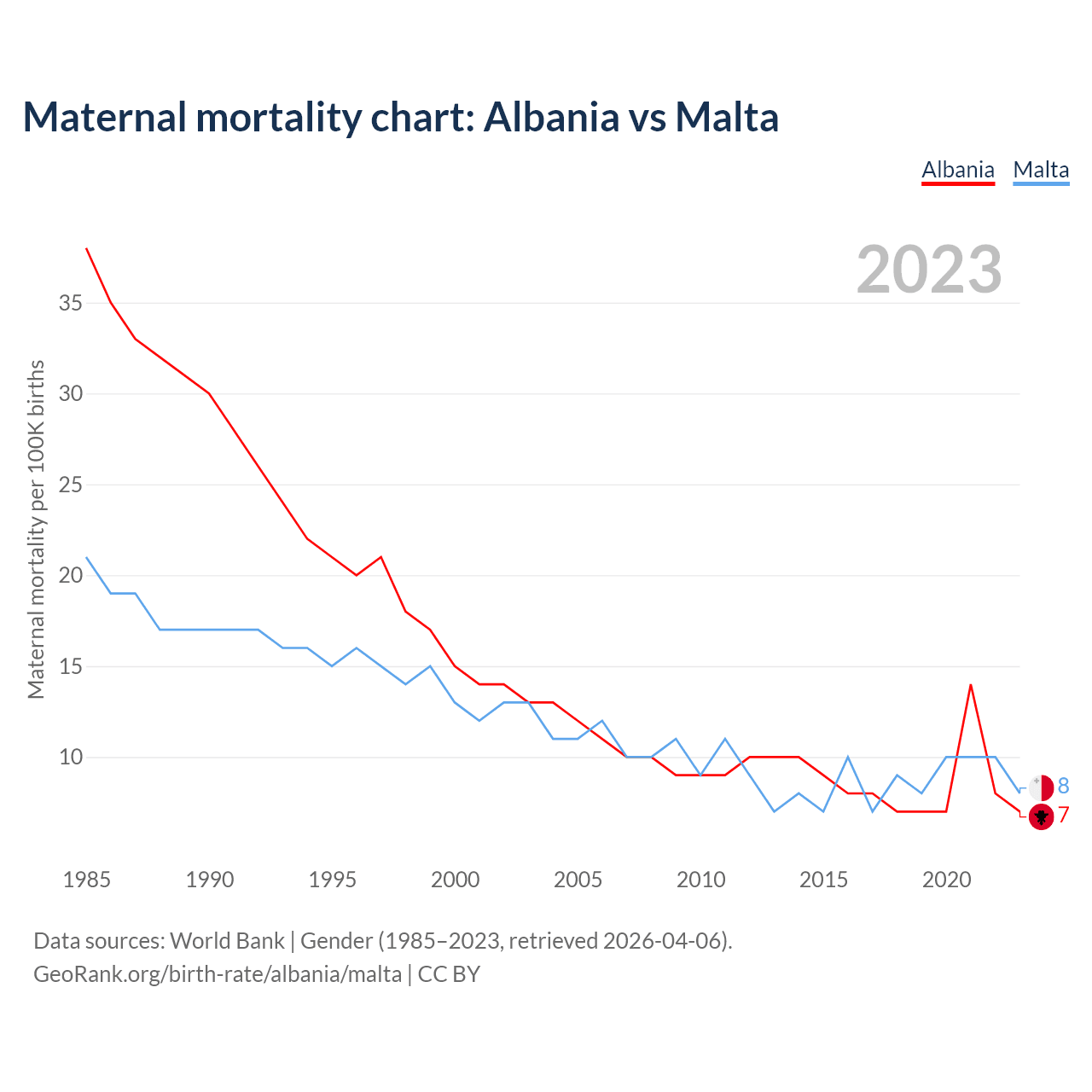 The maternal mortality rate, which is the probability of dying during childbirth or within 42 days of pregnancy termination, is 7 deaths per 100,000 live births in Albania, compared to 8 deaths in Malta.