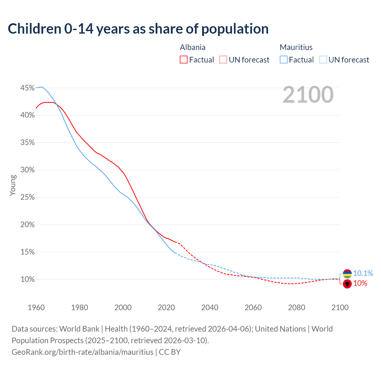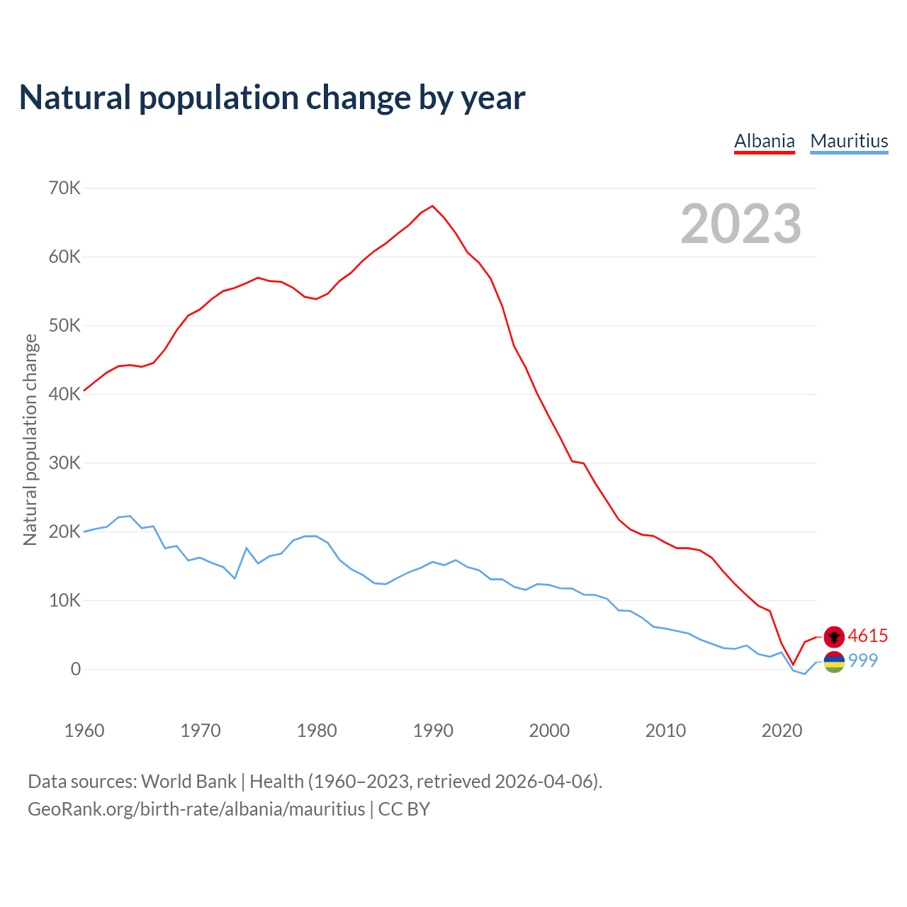 According to the latest available data on birth rates, the fertility rate in Albania was 1.35 children per woman in 2023, compared to 1.39 in Mauritius in 2023. The replacement level is considered to be 2.1 children per woman.