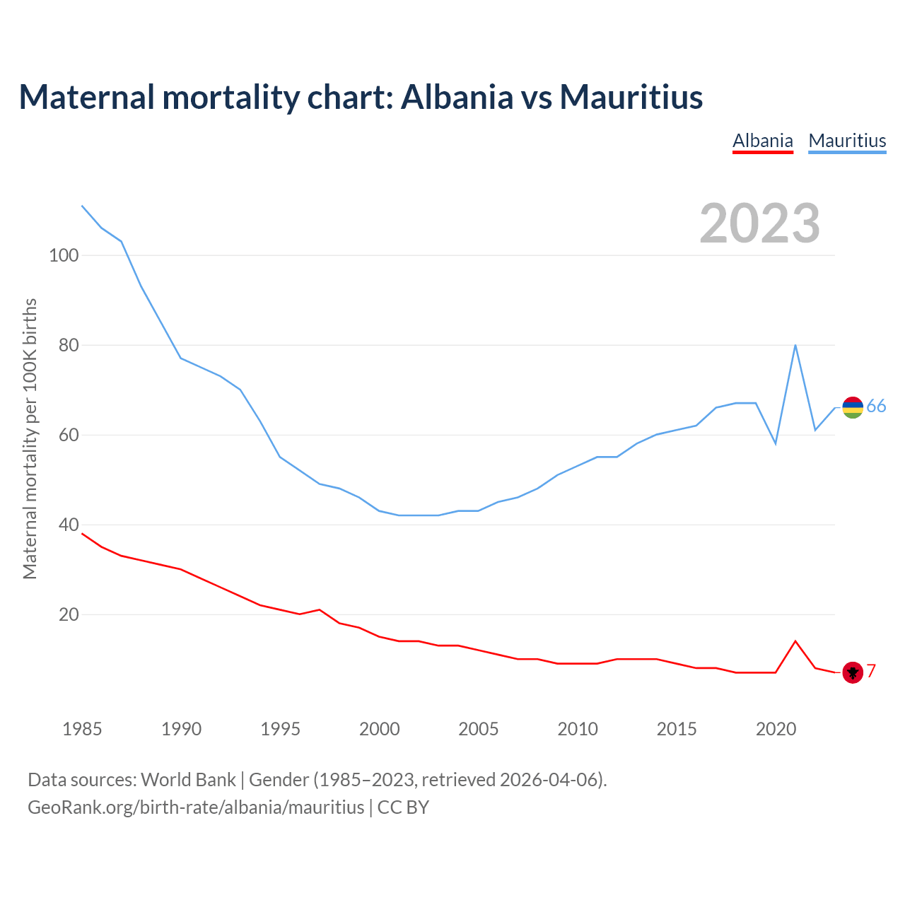 The maternal mortality rate, which is the probability of dying during childbirth or within 42 days of pregnancy termination, is 7 deaths per 100,000 live births in Albania, compared to 66 deaths in Mauritius.