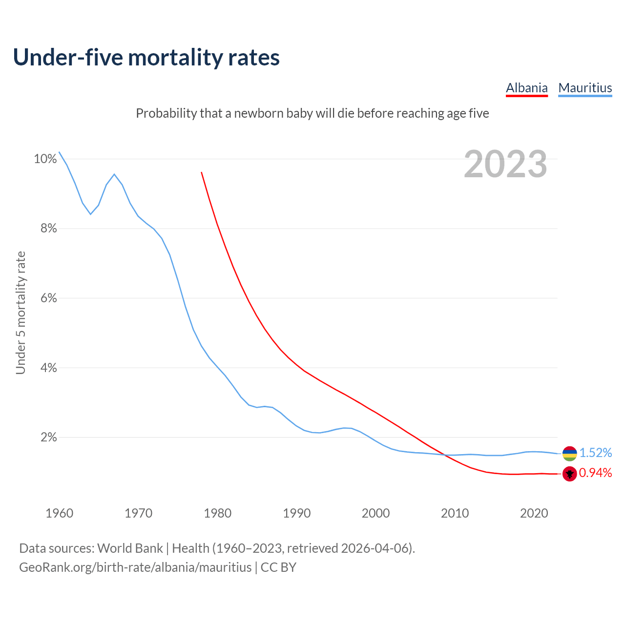 The chance that a newborn baby will die before reaching age five is 0.94% in Albania and 1.52% in Mauritius. Above is a chart with historical data on under-five mortality rates.