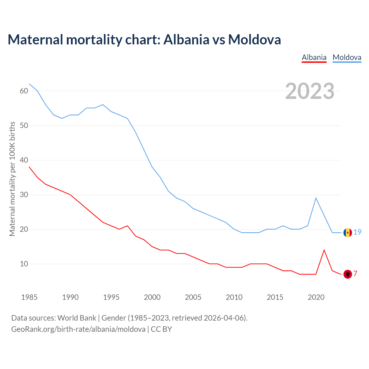 The maternal mortality rate, which is the probability of dying during childbirth or within 42 days of pregnancy termination, is 7 deaths per 100,000 live births in Albania, compared to 19 deaths in Moldova.