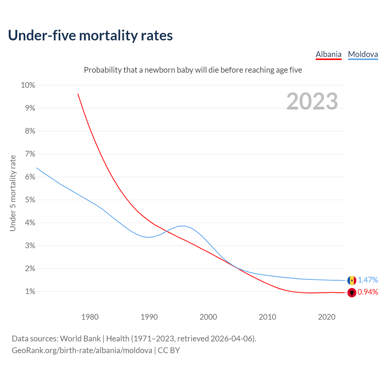 The chance that a newborn baby will die before reaching age five is 0.94% in Albania and 1.47% in Moldova. Above is a chart with historical data on under-five mortality rates.