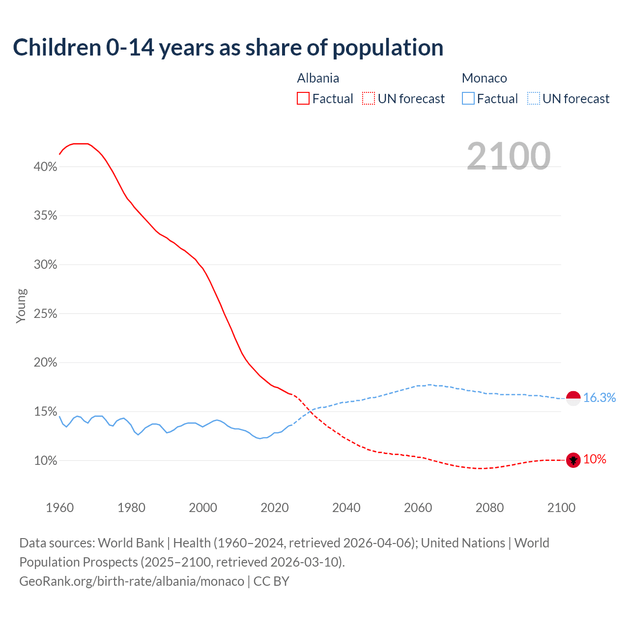 According to the latest available data on birth rates, the fertility rate in Albania was 1.35 children per woman in 2023, compared to 2.11 in Monaco in 2023. The replacement level is considered to be 2.1 children per woman.