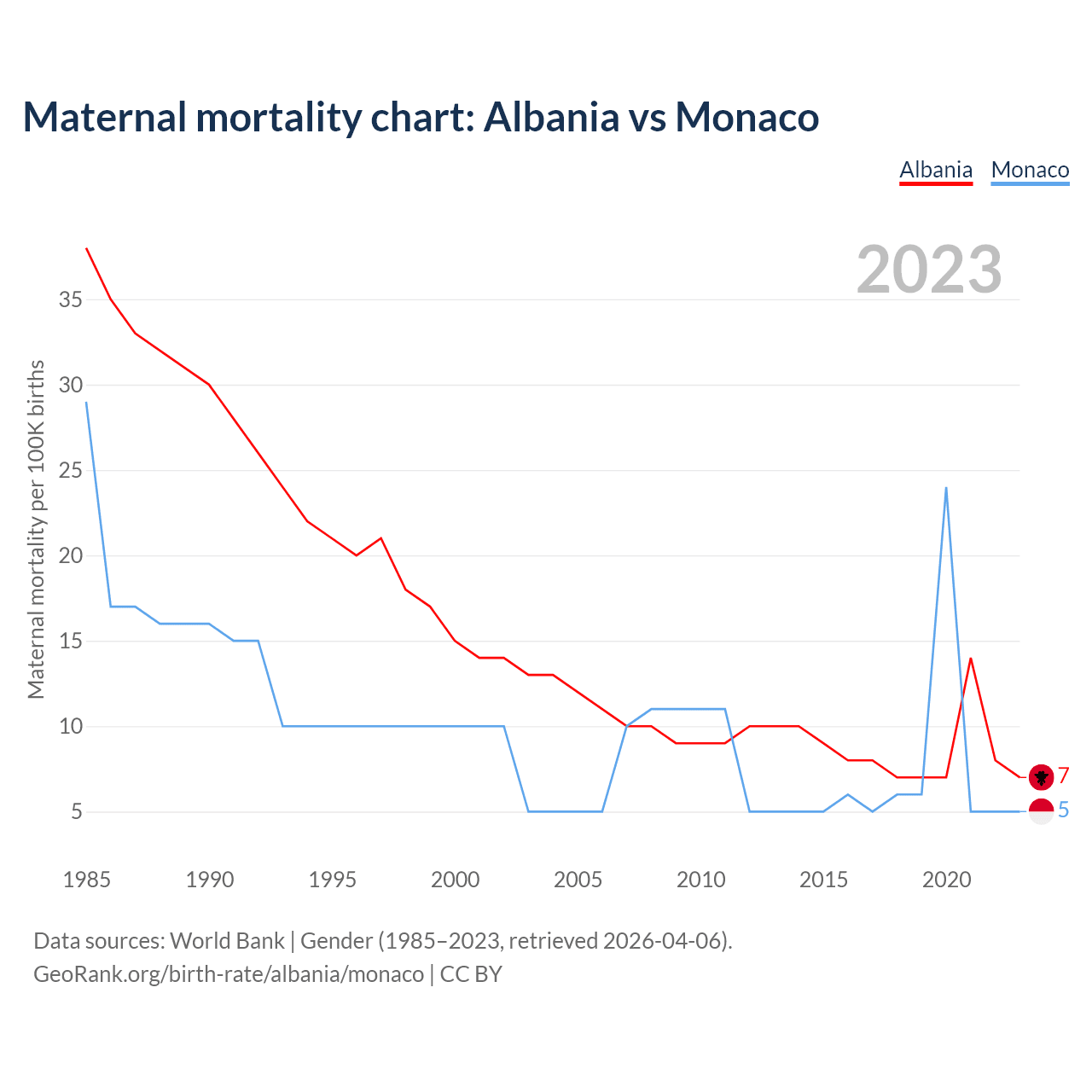 The maternal mortality rate, which is the probability of dying during childbirth or within 42 days of pregnancy termination, is 7 deaths per 100,000 live births in Albania, compared to 5 deaths in Monaco.