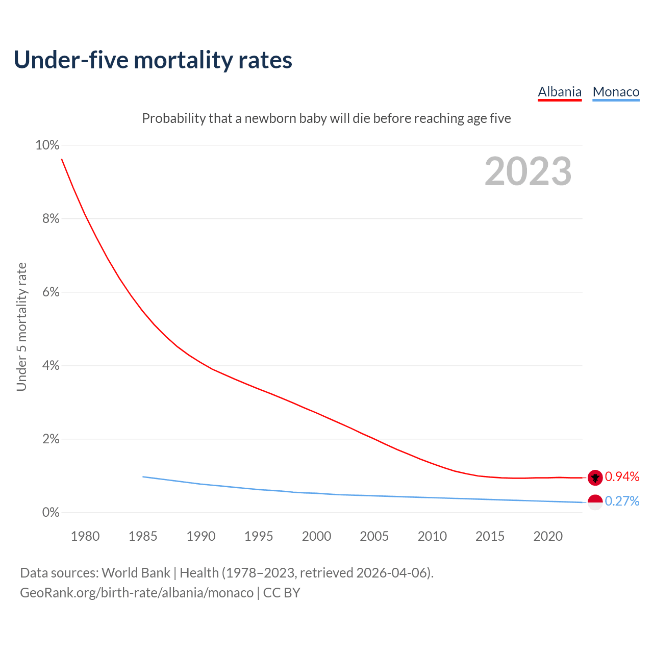 The chance that a newborn baby will die before reaching age five is 0.94% in Albania and 0.27% in Monaco. Above is a chart with historical data on under-five mortality rates.