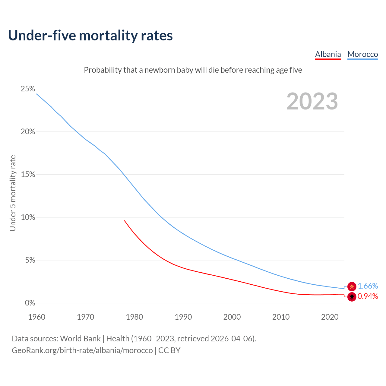 The chance that a newborn baby will die before reaching age five is 0.94% in Albania and 1.66% in Morocco. Above is a chart with historical data on under-five mortality rates.