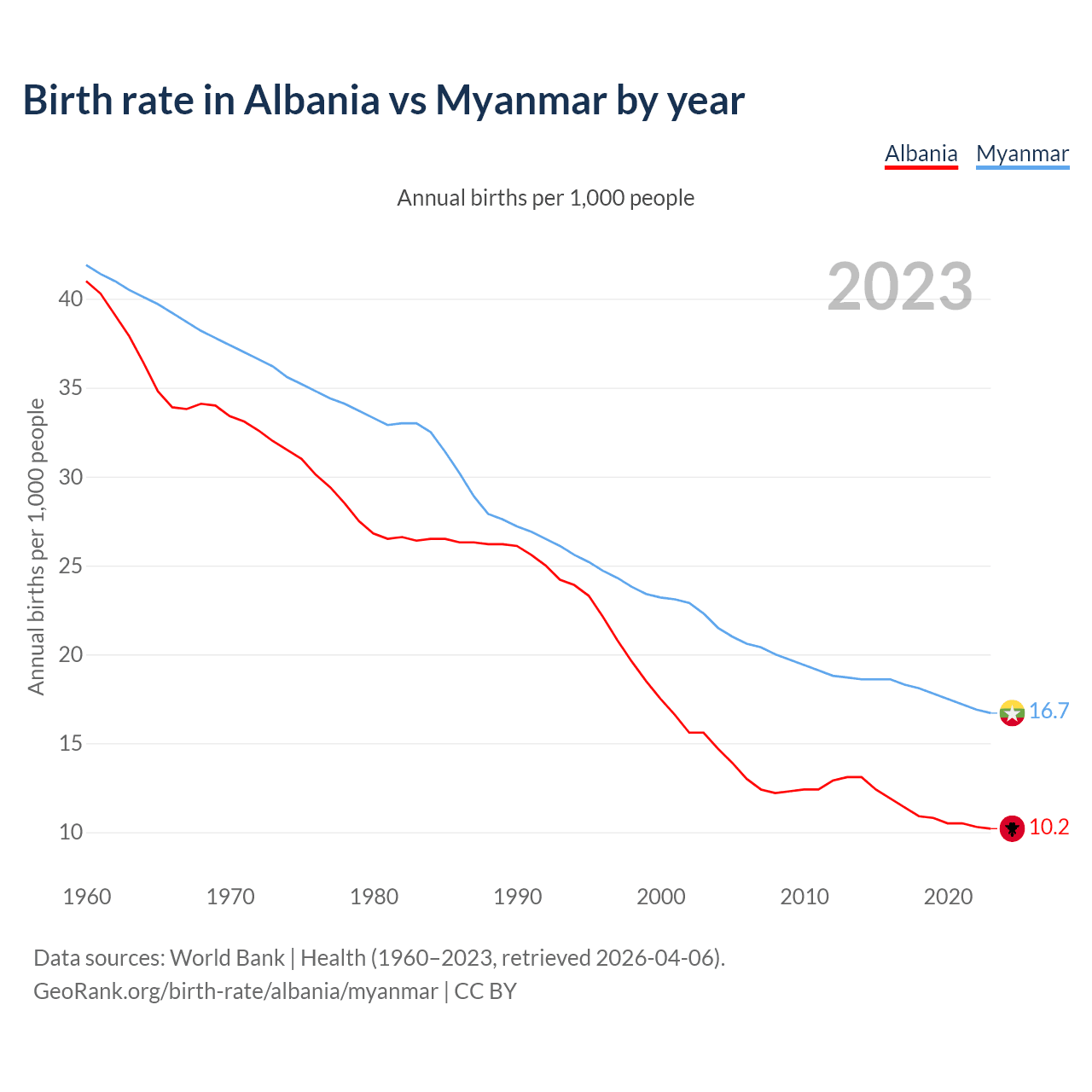 Albania has an annual birth rate of 10.2 births per 1,000 people, compared to 16.7 for Myanmar. The average number of children a woman is expected to have during her lifetime — the fertility rate, is 1.35 in Albania and 2.12 in Myanmar — 56.9% difference.