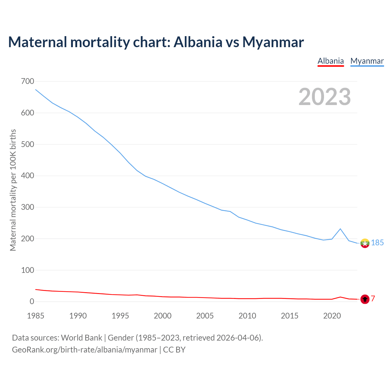 The maternal mortality rate, which is the probability of dying during childbirth or within 42 days of pregnancy termination, is 7 deaths per 100,000 live births in Albania, compared to 185 deaths in Myanmar.
