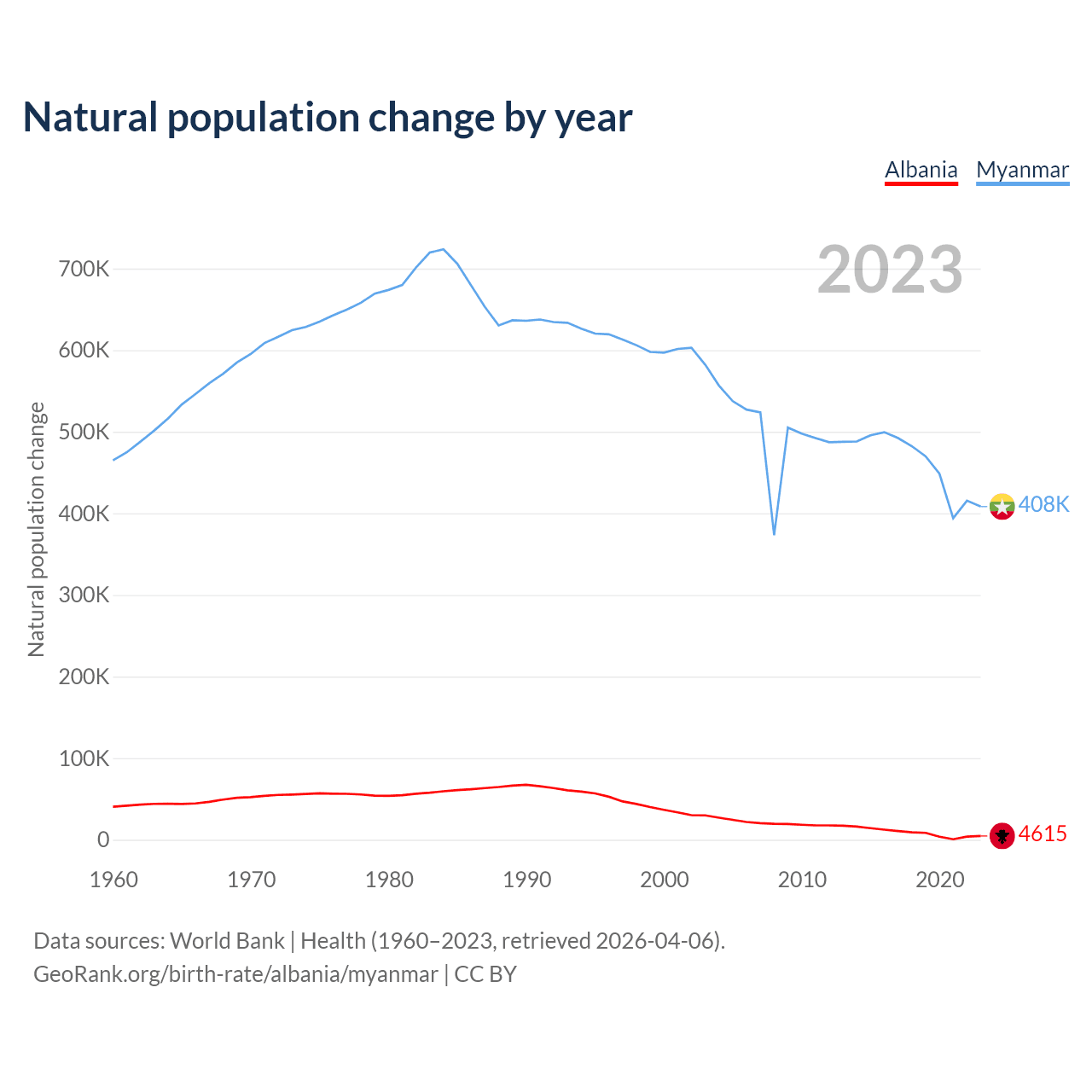 According to the latest available data on birth rates, the fertility rate in Albania was 1.35 children per woman in 2023, compared to 2.12 in Myanmar in 2023. The replacement level is considered to be 2.1 children per woman.