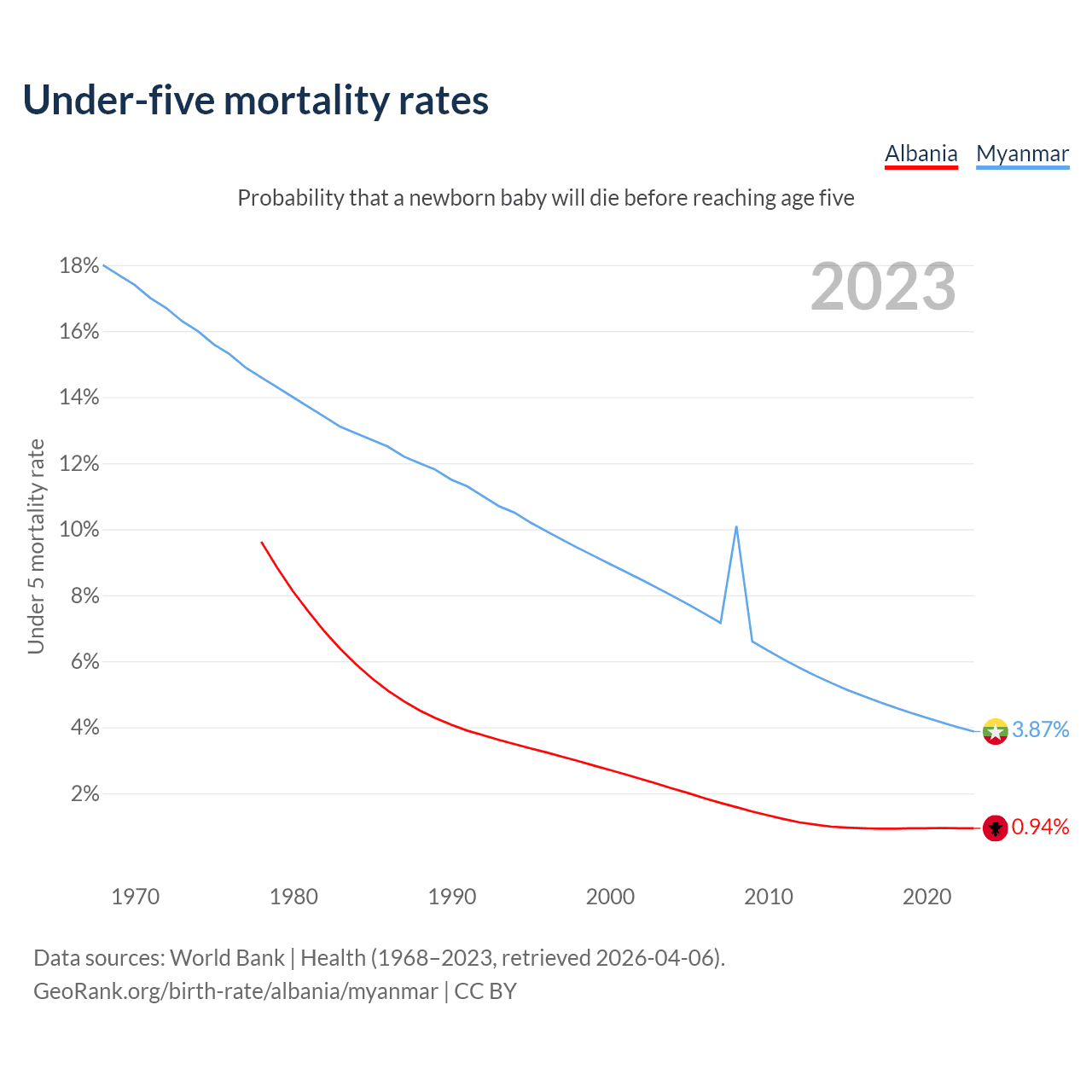 The chance that a newborn baby will die before reaching age five is 0.94% in Albania and 3.87% in Myanmar. Above is a chart with historical data on under-five mortality rates.