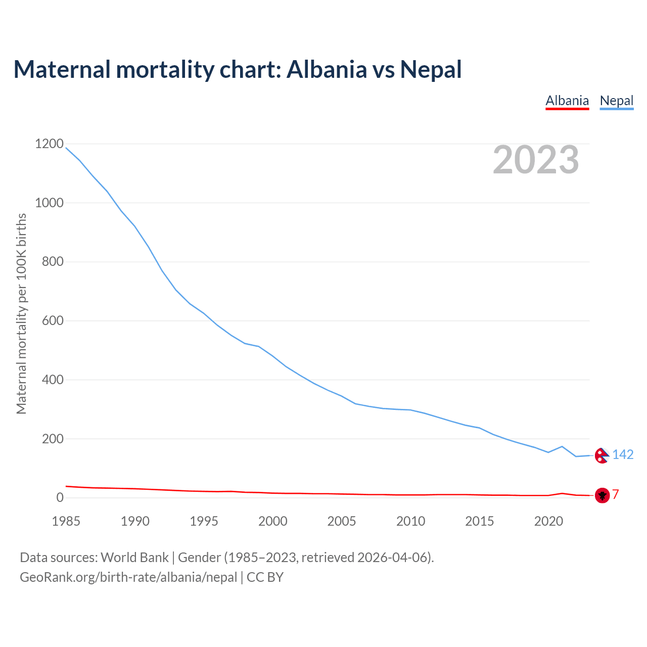 The maternal mortality rate, which is the probability of dying during childbirth or within 42 days of pregnancy termination, is 7 deaths per 100,000 live births in Albania, compared to 142 deaths in Nepal.
