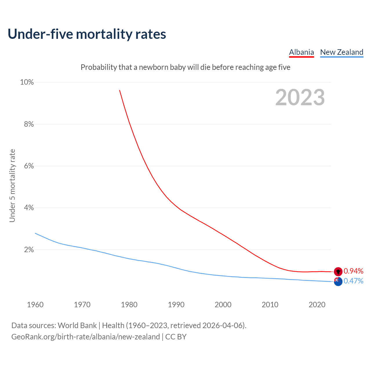The chance that a newborn baby will die before reaching age five is 0.94% in Albania and 0.47% in New Zealand. Above is a chart with historical data on under-five mortality rates.