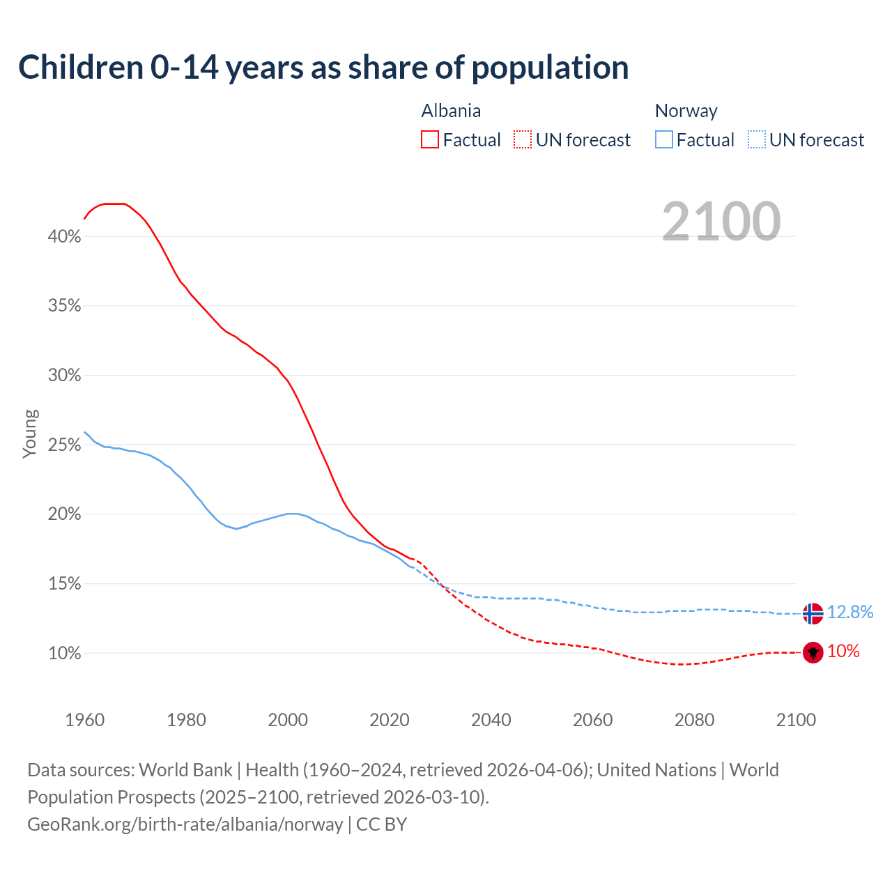 According to the latest available data on birth rates, the fertility rate in Albania was 1.35 children per woman in 2023, compared to 1.4 in Norway in 2023. The replacement level is considered to be 2.1 children per woman.