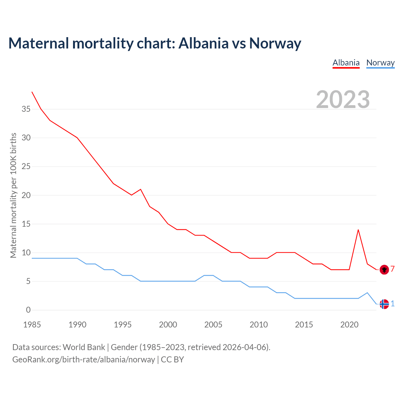The maternal mortality rate, which is the probability of dying during childbirth or within 42 days of pregnancy termination, is 7 deaths per 100,000 live births in Albania, compared to 1 deaths in Norway.