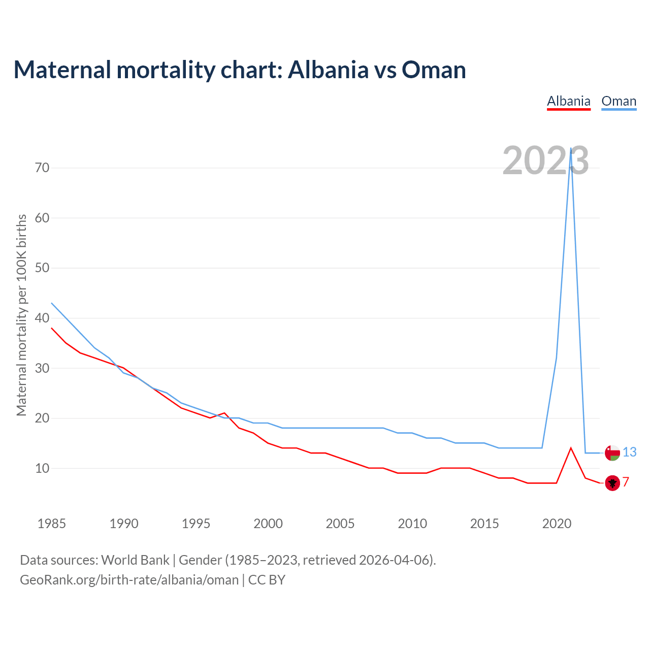 The maternal mortality rate, which is the probability of dying during childbirth or within 42 days of pregnancy termination, is 7 deaths per 100,000 live births in Albania, compared to 13 deaths in Oman.