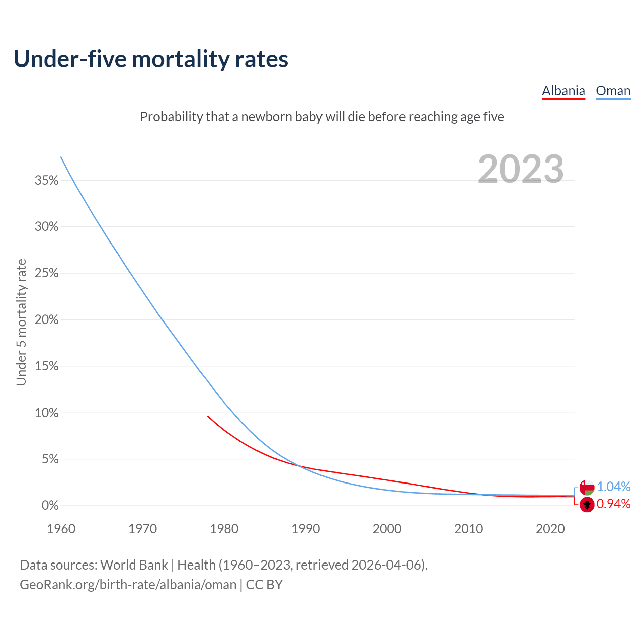 The chance that a newborn baby will die before reaching age five is 0.94% in Albania and 1.04% in Oman. Above is a chart with historical data on under-five mortality rates.