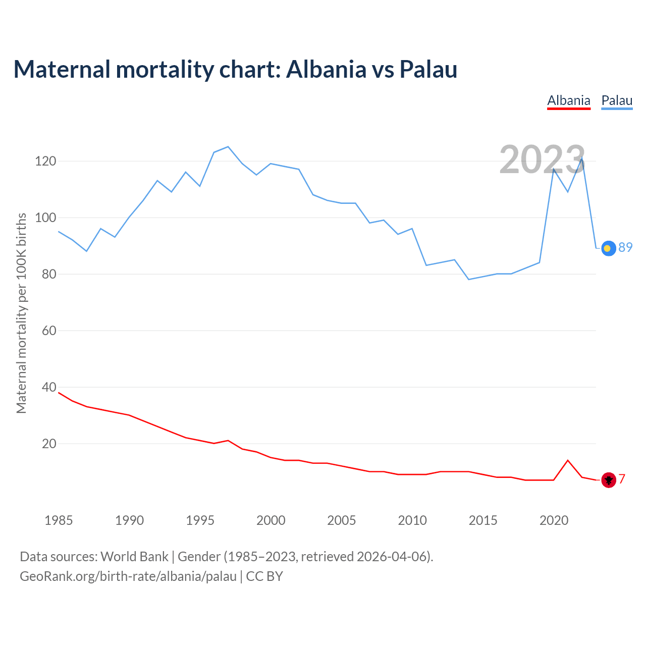 The maternal mortality rate, which is the probability of dying during childbirth or within 42 days of pregnancy termination, is 7 deaths per 100,000 live births in Albania, compared to 89 deaths in Palau.