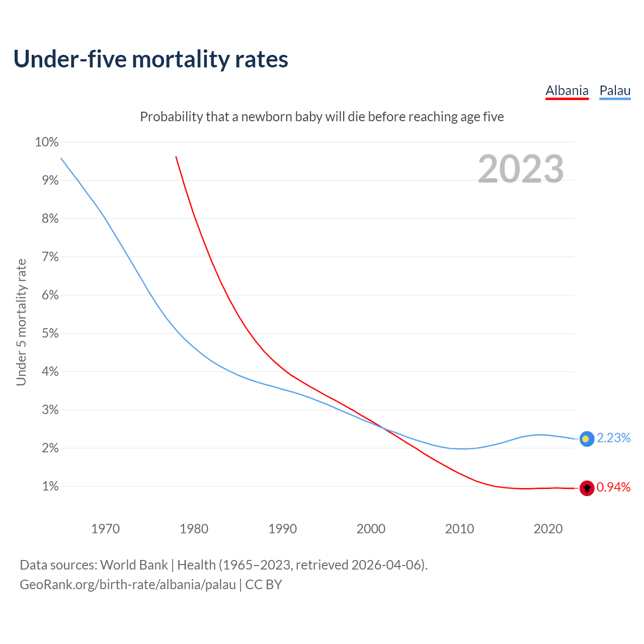 The chance that a newborn baby will die before reaching age five is 0.94% in Albania and 2.23% in Palau. Above is a chart with historical data on under-five mortality rates.