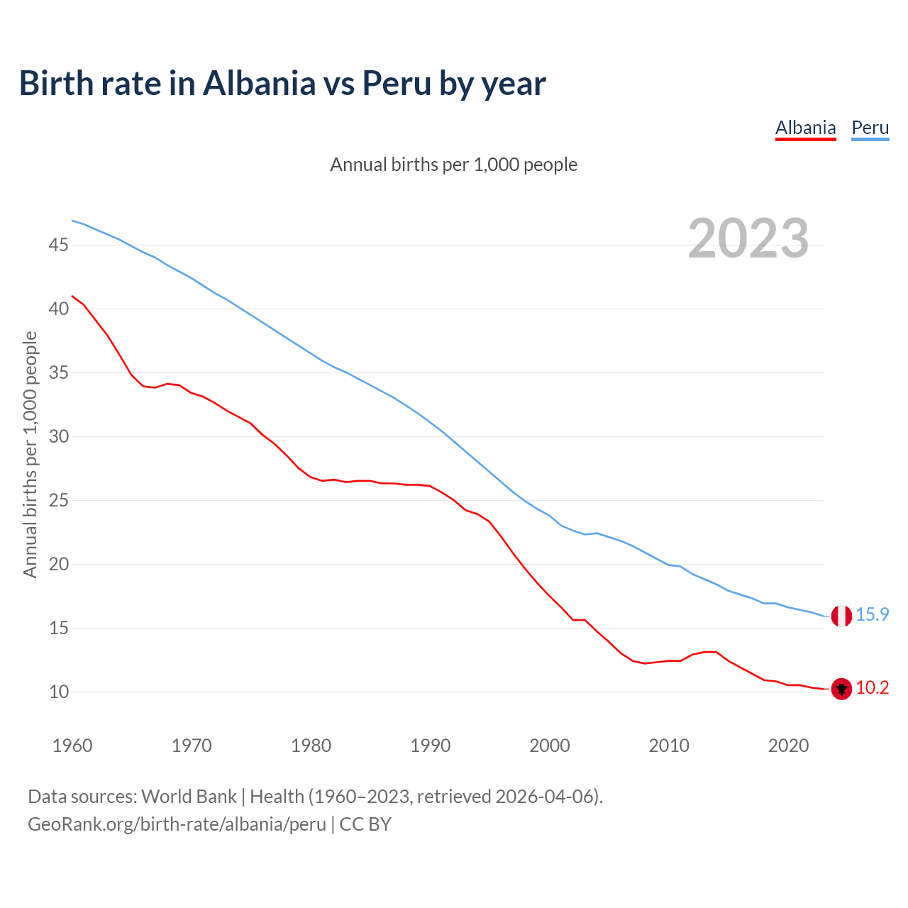Albania has an annual birth rate of 10.2 births per 1,000 people, compared to 15.9 for Peru. The average number of children a woman is expected to have during her lifetime — the fertility rate, is 1.35 in Albania and 1.98 in Peru — 46.9% difference.