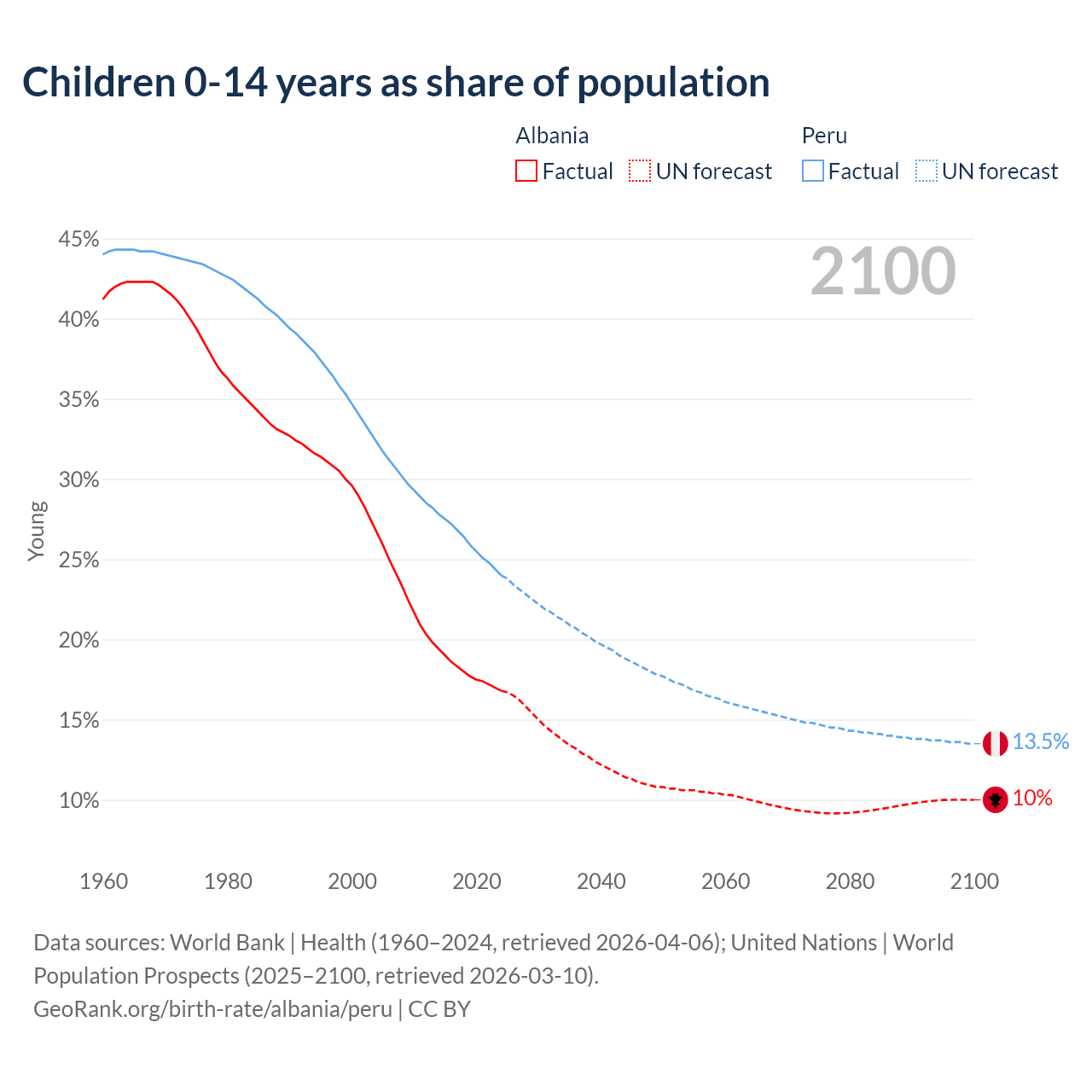 According to the latest available data on birth rates, the fertility rate in Albania was 1.35 children per woman in 2023, compared to 1.98 in Peru in 2023. The replacement level is considered to be 2.1 children per woman.