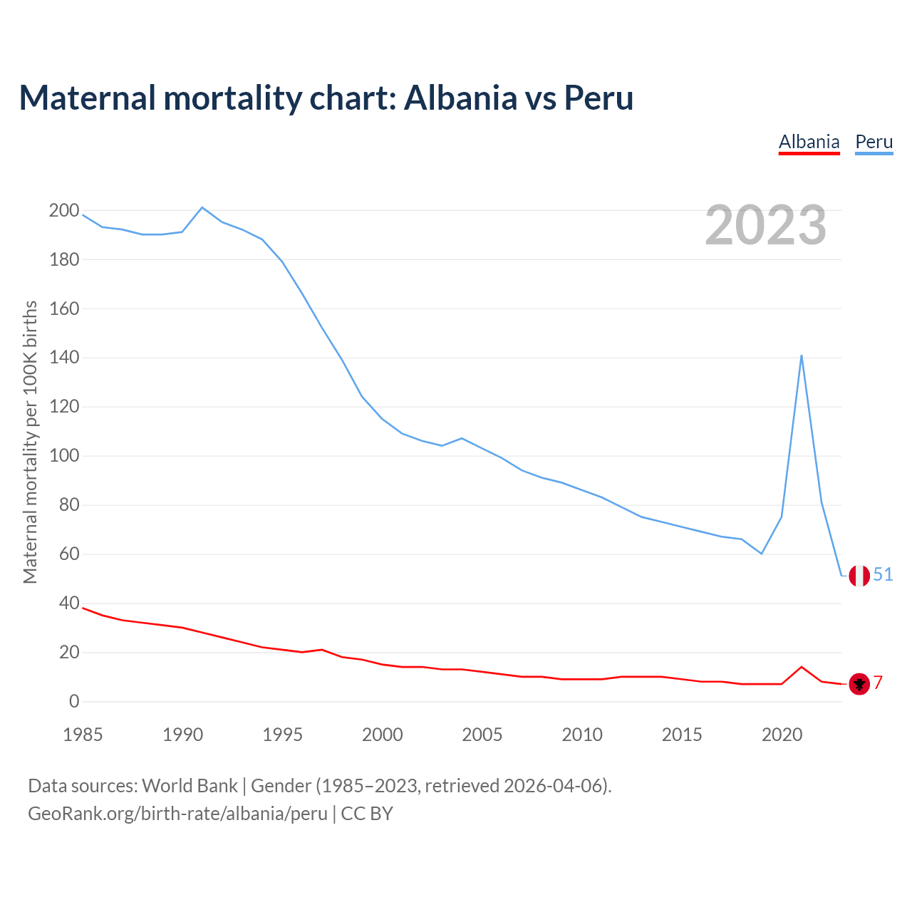 The maternal mortality rate, which is the probability of dying during childbirth or within 42 days of pregnancy termination, is 7 deaths per 100,000 live births in Albania, compared to 51 deaths in Peru.