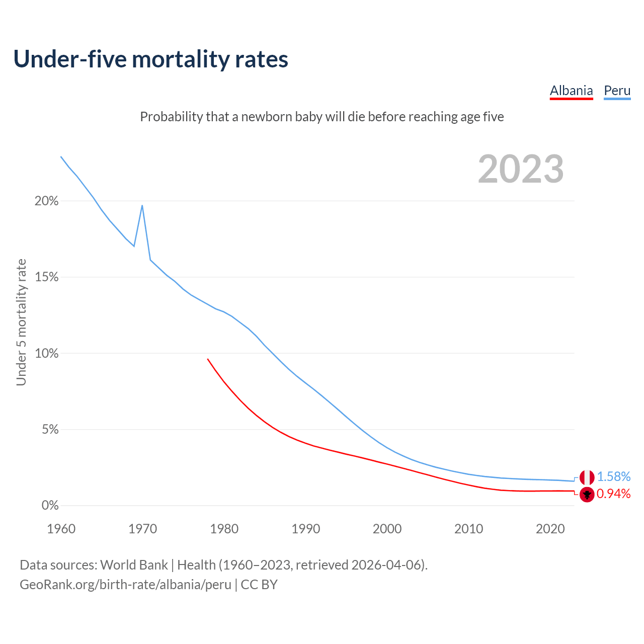 The chance that a newborn baby will die before reaching age five is 0.94% in Albania and 1.58% in Peru. Above is a chart with historical data on under-five mortality rates.