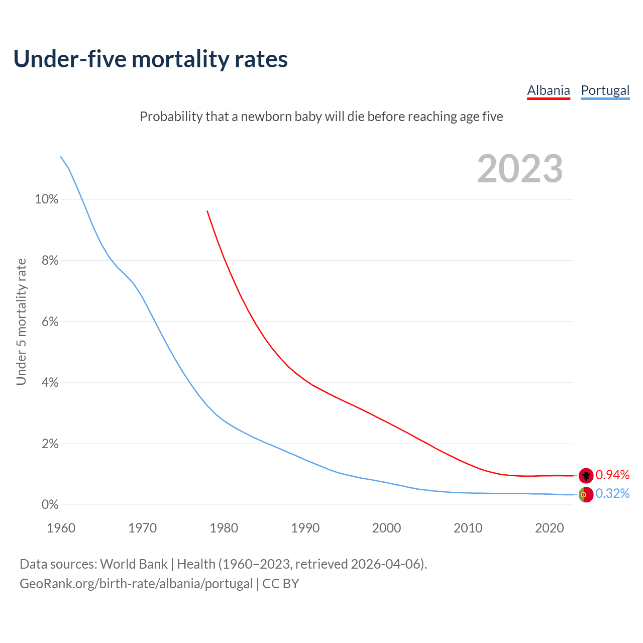 The chance that a newborn baby will die before reaching age five is 0.94% in Albania and 0.32% in Portugal. Above is a chart with historical data on under-five mortality rates.