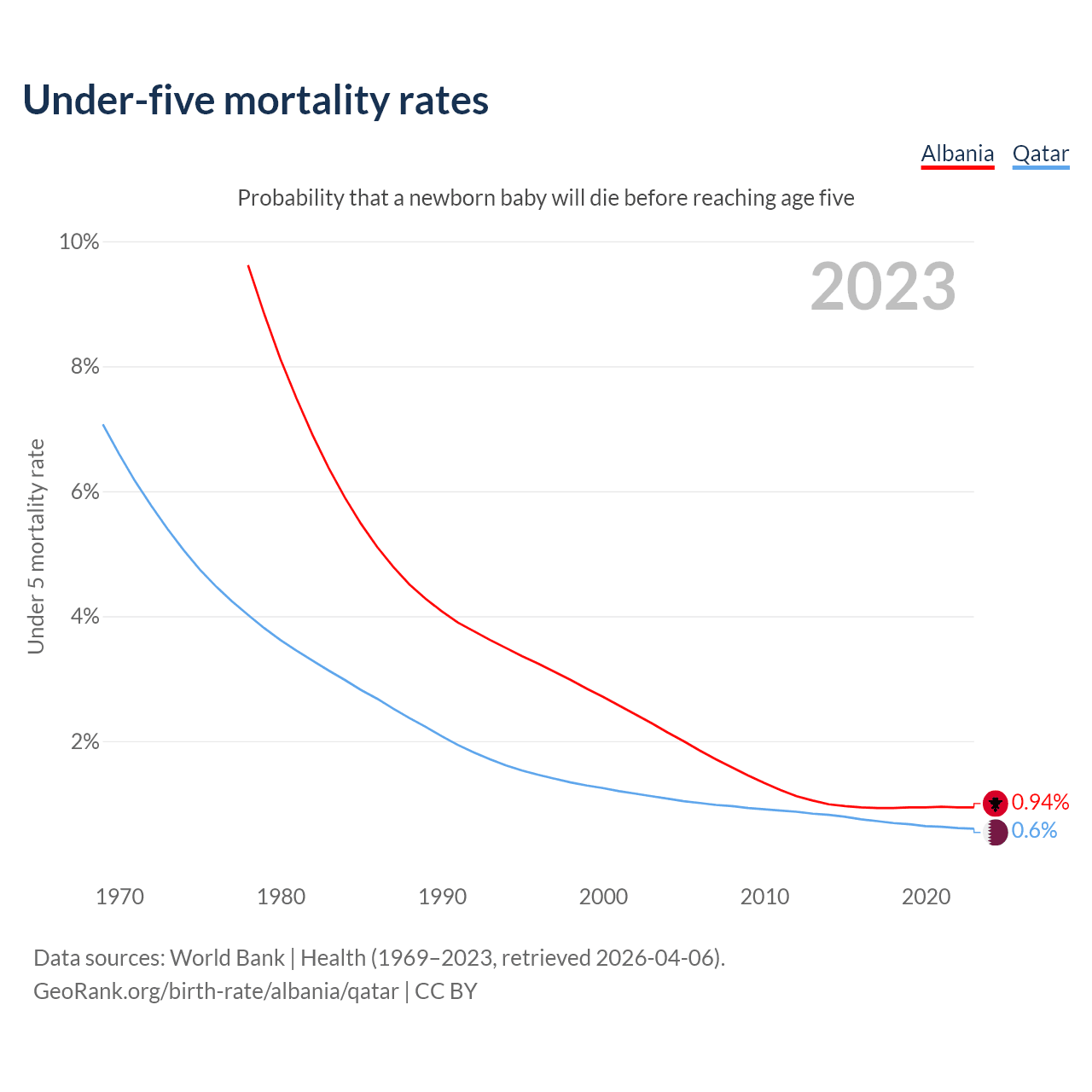 The chance that a newborn baby will die before reaching age five is 0.94% in Albania and 0.6% in Qatar. Above is a chart with historical data on under-five mortality rates.