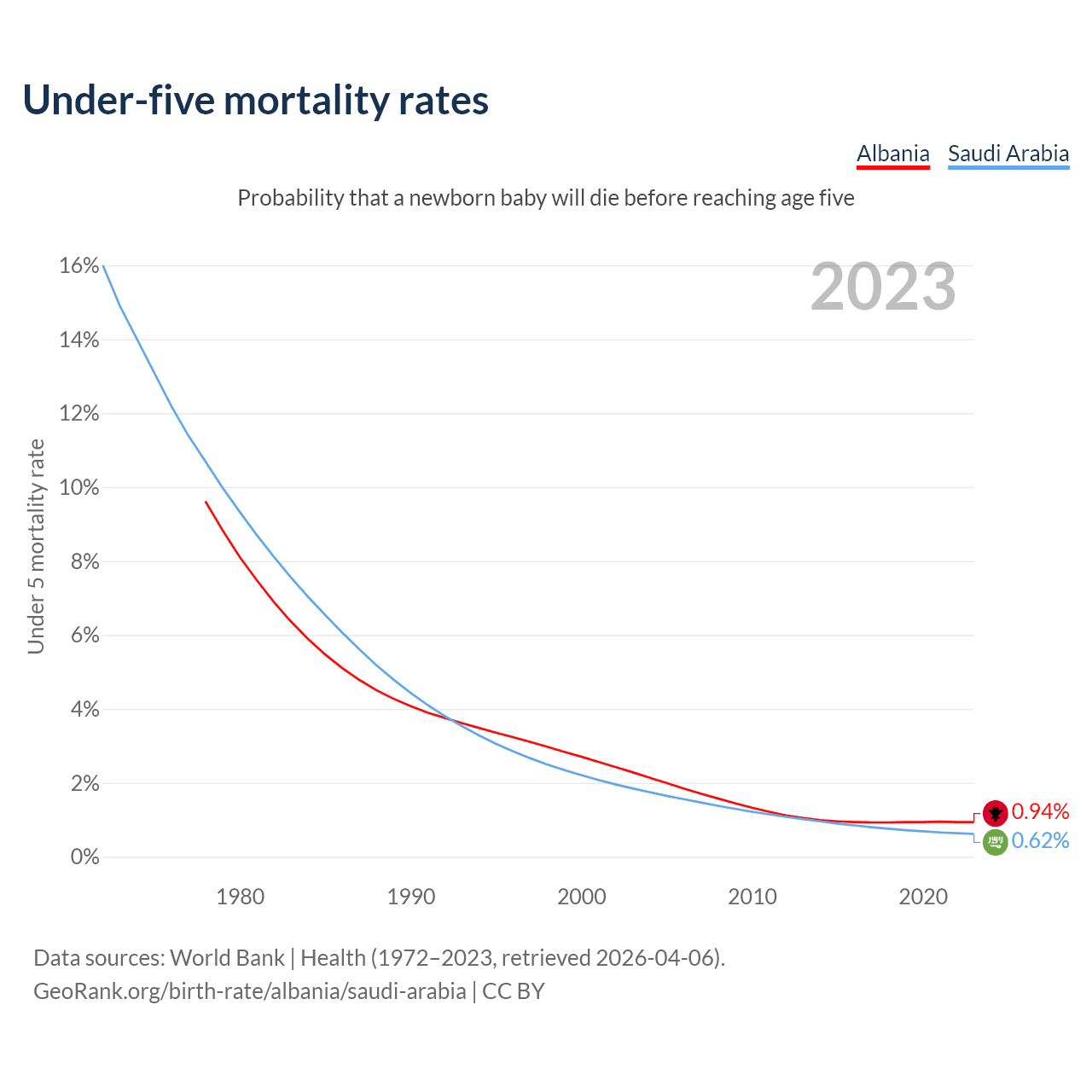 The chance that a newborn baby will die before reaching age five is 0.94% in Albania and 0.62% in Saudi Arabia. Above is a chart with historical data on under-five mortality rates.