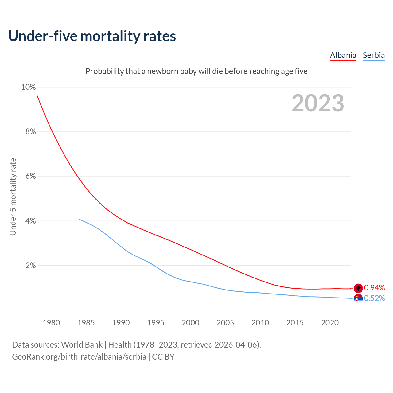 The chance that a newborn baby will die before reaching age five is 0.94% in Albania and 0.52% in Serbia. Above is a chart with historical data on under-five mortality rates.