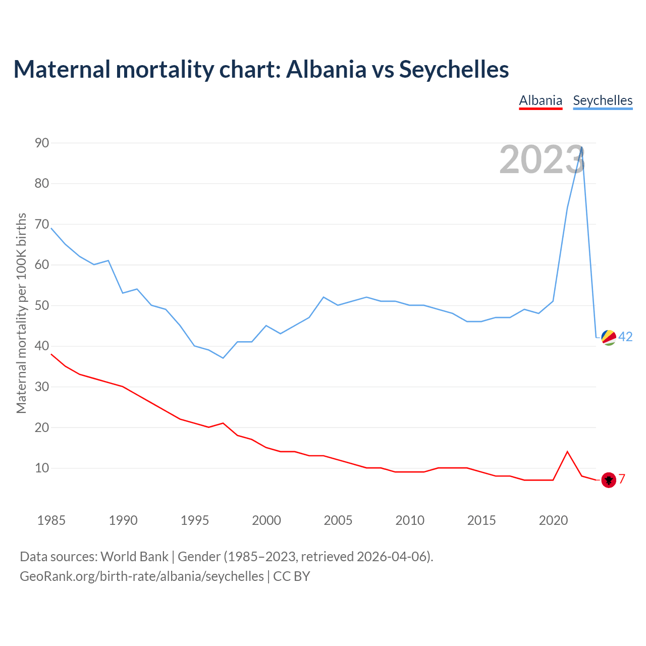 The maternal mortality rate, which is the probability of dying during childbirth or within 42 days of pregnancy termination, is 7 deaths per 100,000 live births in Albania, compared to 42 deaths in the Seychelles.