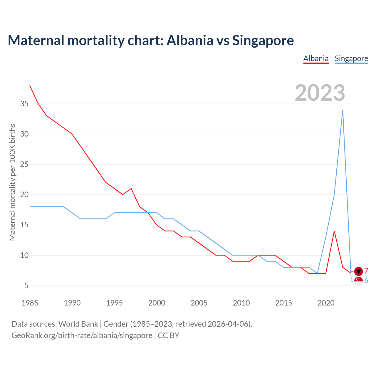The maternal mortality rate, which is the probability of dying during childbirth or within 42 days of pregnancy termination, is 7 deaths per 100,000 live births in Albania, compared to 6 deaths in Singapore.