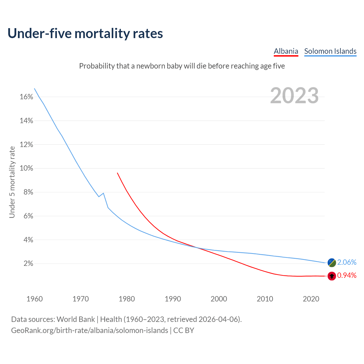 The chance that a newborn baby will die before reaching age five is 0.94% in Albania and 2.06% in the Solomon Islands. Above is a chart with historical data on under-five mortality rates.