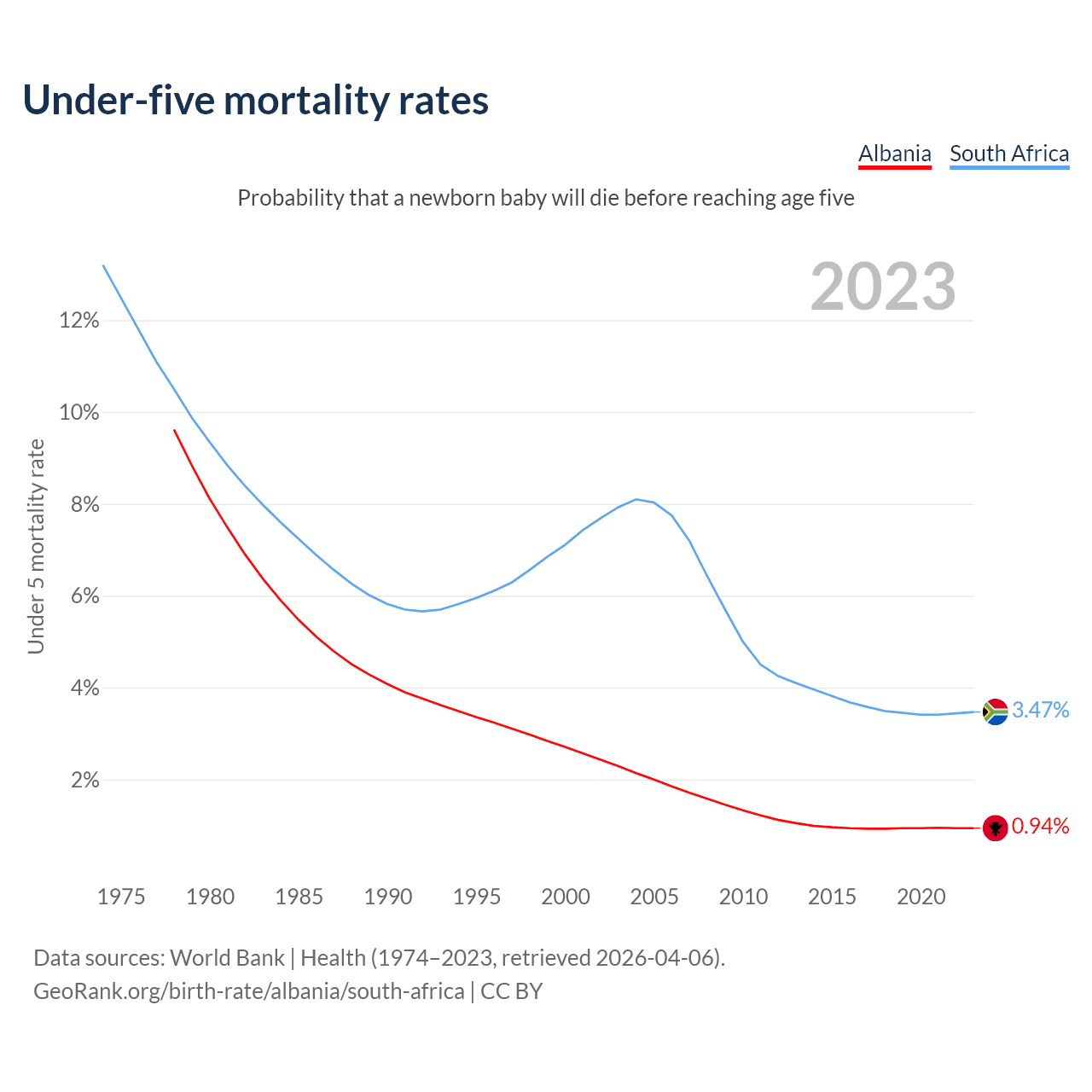The chance that a newborn baby will die before reaching age five is 0.94% in Albania and 3.47% in South Africa. Above is a chart with historical data on under-five mortality rates.