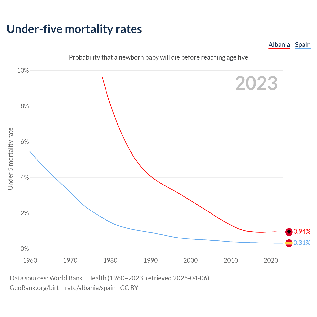 The chance that a newborn baby will die before reaching age five is 0.94% in Albania and 0.31% in Spain. Above is a chart with historical data on under-five mortality rates.