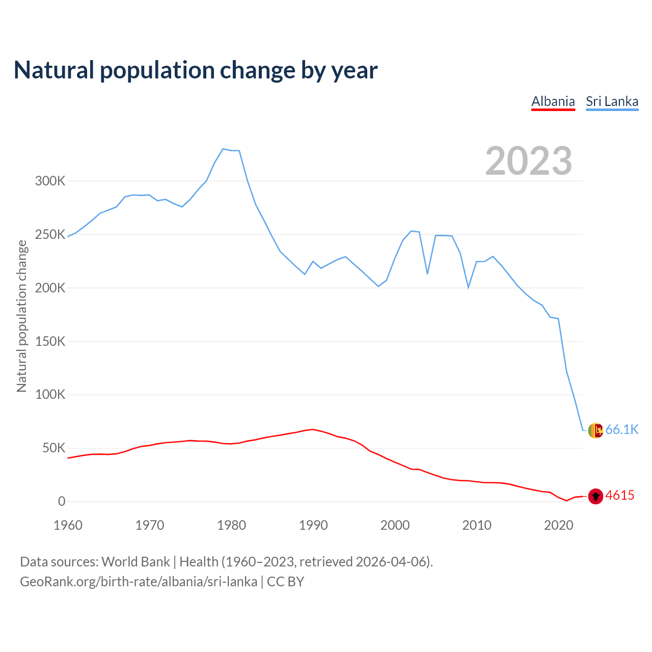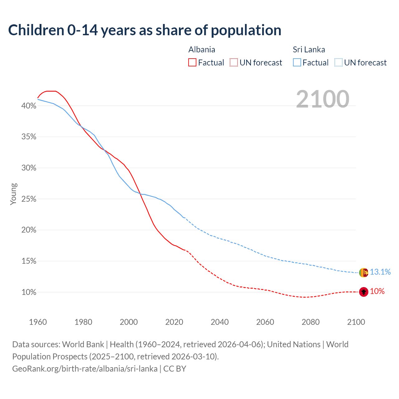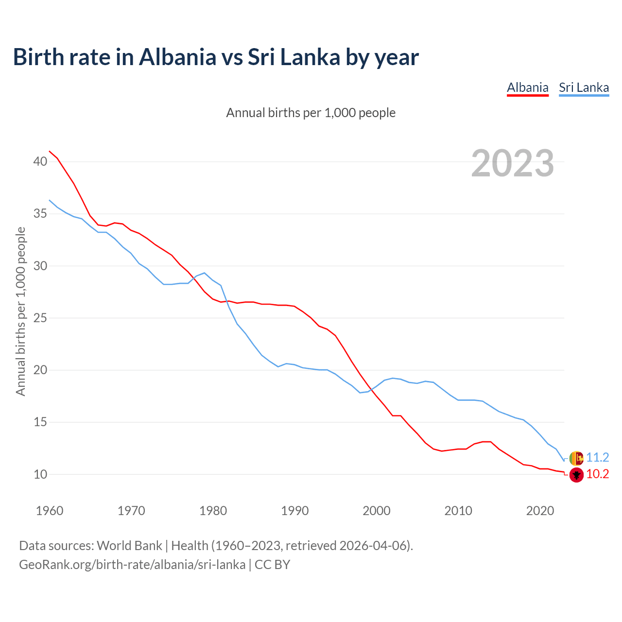 Albania has an annual birth rate of 10.2 births per 1,000 people, compared to 11.2 for Sri Lanka. The average number of children a woman is expected to have during her lifetime — the fertility rate, is 1.35 in Albania and 1.97 in Sri Lanka — 46.4% difference.