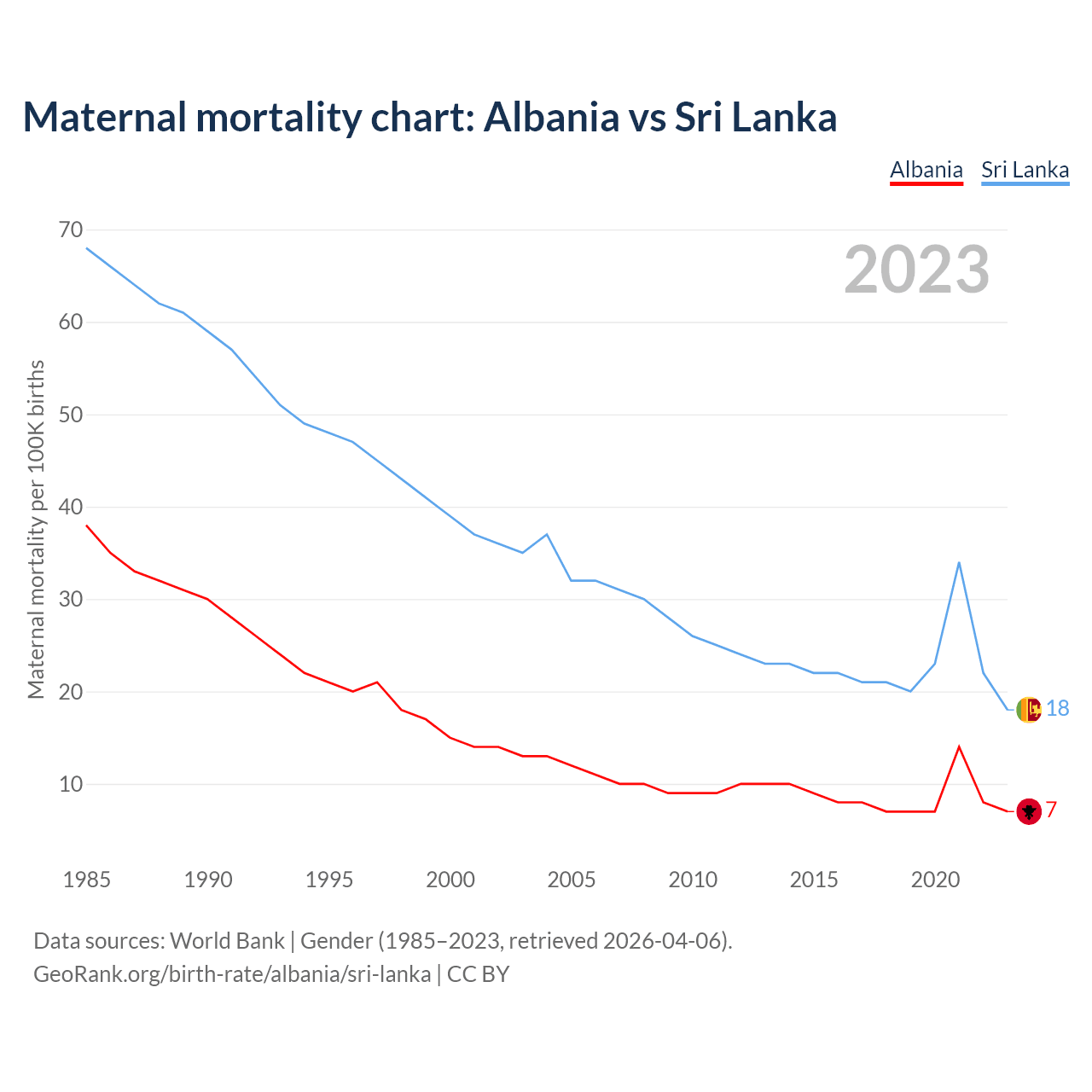 The maternal mortality rate, which is the probability of dying during childbirth or within 42 days of pregnancy termination, is 7 deaths per 100,000 live births in Albania, compared to 18 deaths in Sri Lanka.