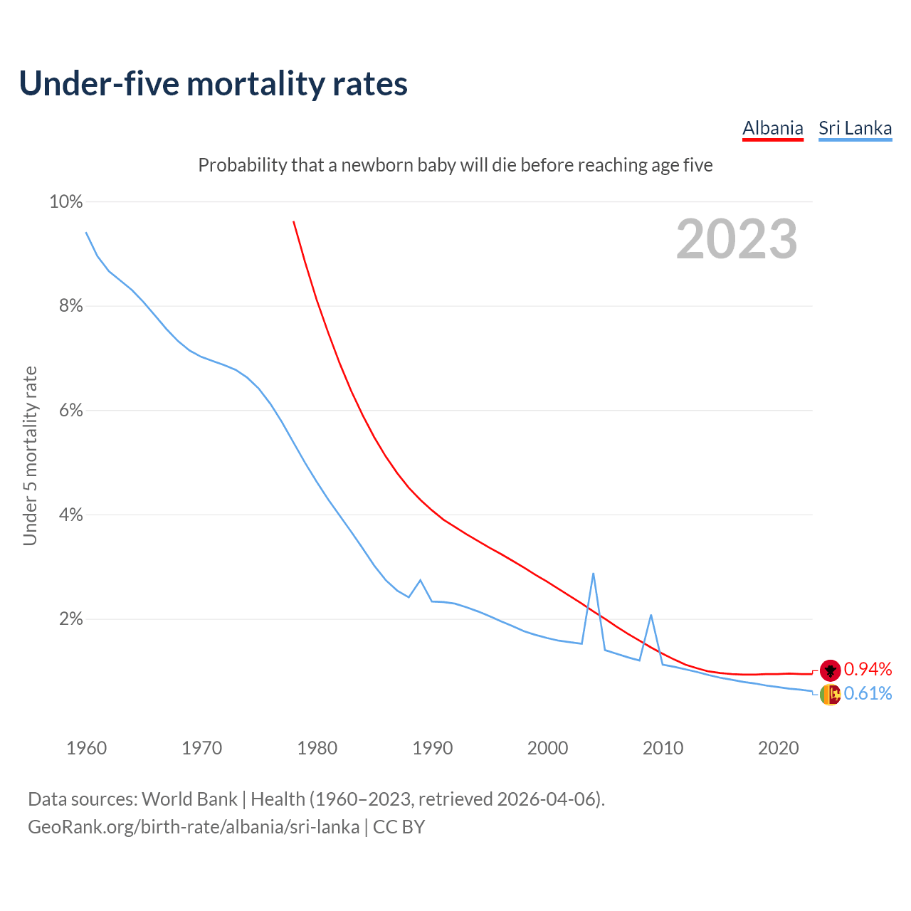 The chance that a newborn baby will die before reaching age five is 0.94% in Albania and 0.61% in Sri Lanka. Above is a chart with historical data on under-five mortality rates.