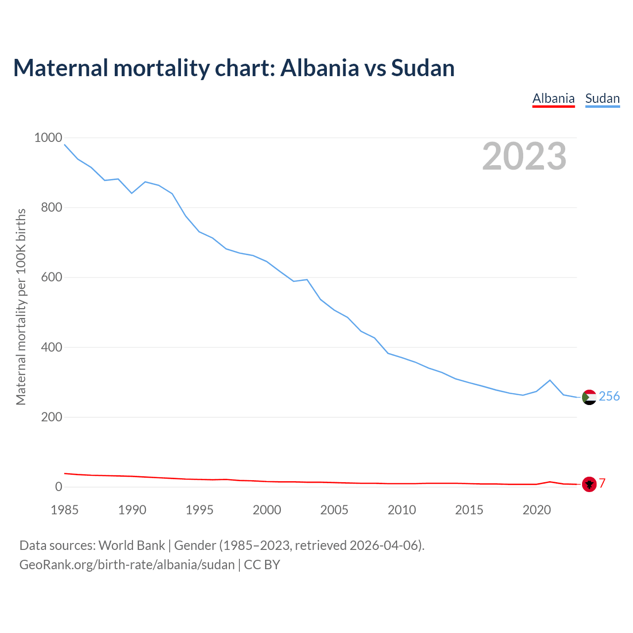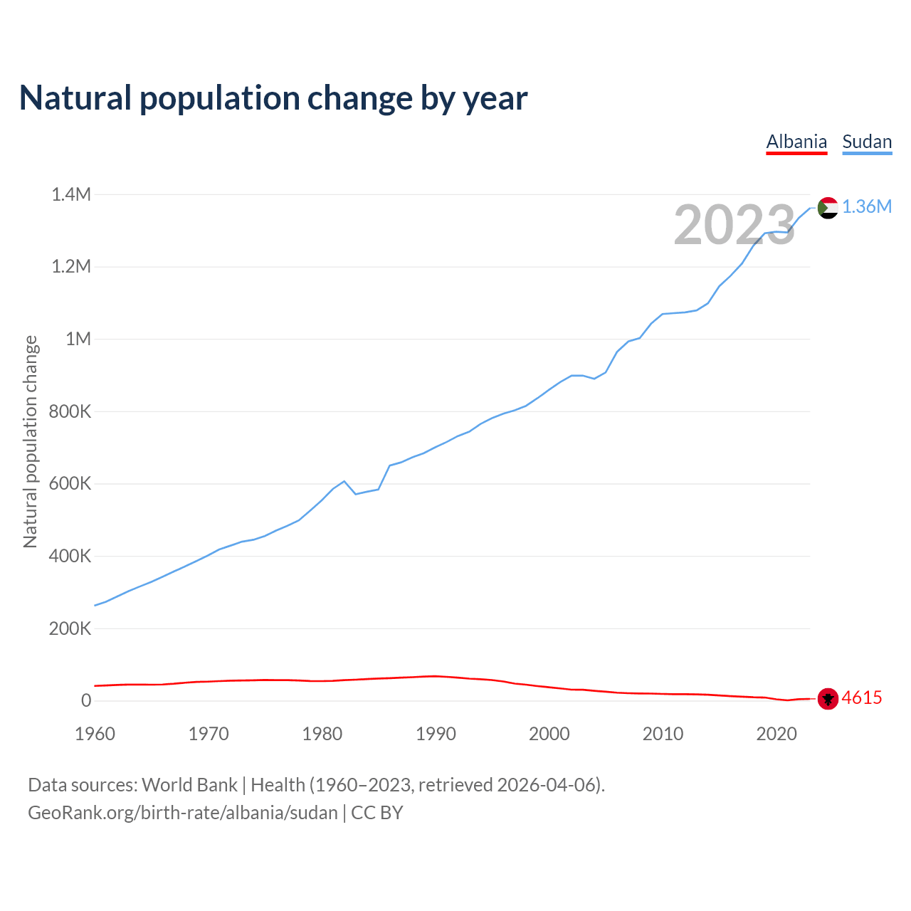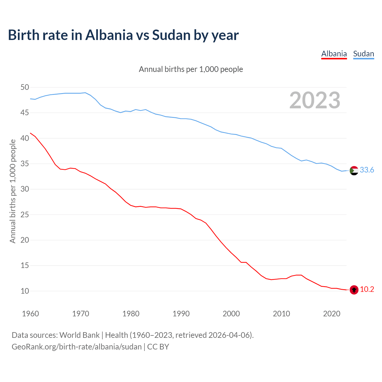 Albania has an annual birth rate of 10.2 births per 1,000 people, compared to 33.6 for Sudan. The average number of children a woman is expected to have during her lifetime — the fertility rate, is 1.35 in Albania and 4.32 in Sudan — 220.7% difference.