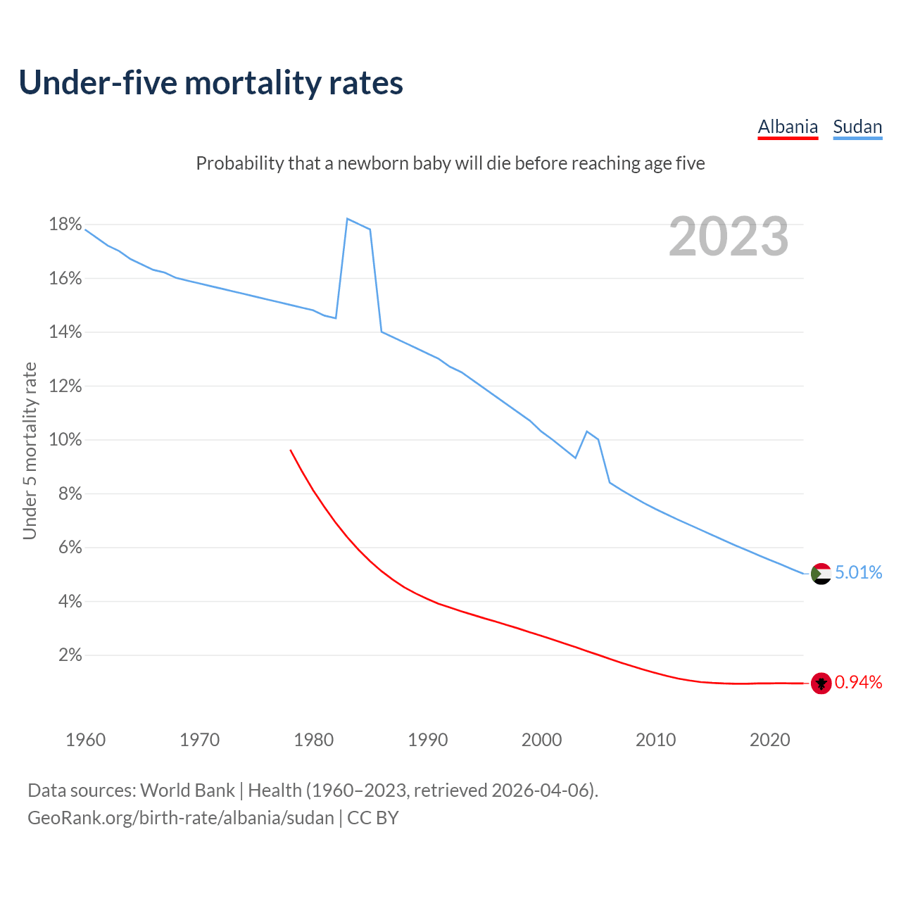 The chance that a newborn baby will die before reaching age five is 0.94% in Albania and 5.01% in Sudan. Above is a chart with historical data on under-five mortality rates.
