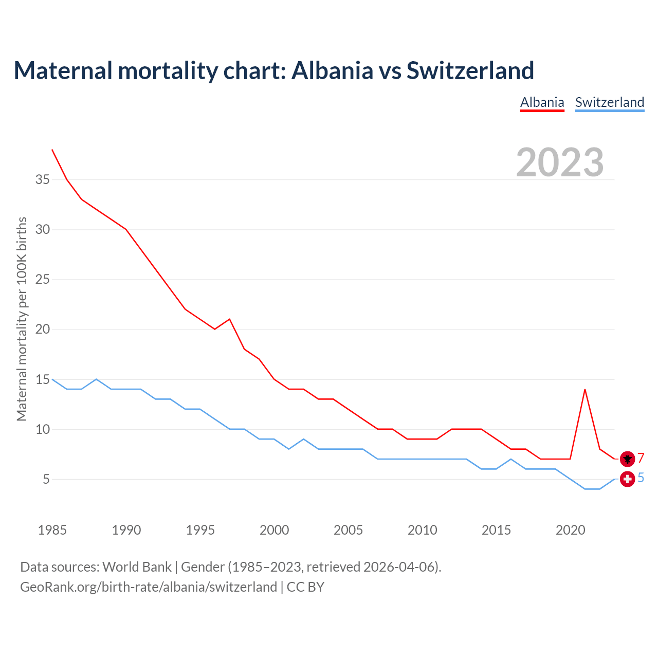 The maternal mortality rate, which is the probability of dying during childbirth or within 42 days of pregnancy termination, is 7 deaths per 100,000 live births in Albania, compared to 5 deaths in Switzerland.